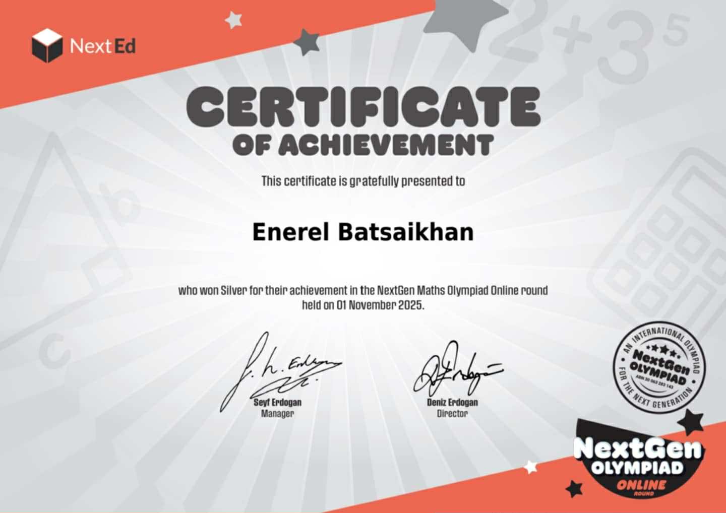 Австралийн NEXTGEN OLYMPIAD-ын Математикийн төрөлд Кембрижийн хөтөлбөртэй Их засаг лицей сургуулийн 5А ангийн сурагч Б.Энэрэл амжилттай оролцон мөнгөн медаль хүртэж 2026 оны 4 дүгээр сарын 13-16-ны хооронд Австралийн Сидней хотод болох ОЛОН УЛСЫН ФИНАЛ-д оролцох эрхтэй боллоо. БАЯР ХҮРГЭЕ!NextGen Olympiad нь онлайн урьдчилсан ба олон улс гэсэн хоёр шатнаас бүрдэх бөгөөд Австралийн сургалтын хөтөлбөрийн агуулгаар 25 асуултад 60 минутад хариулдаг юм байна.