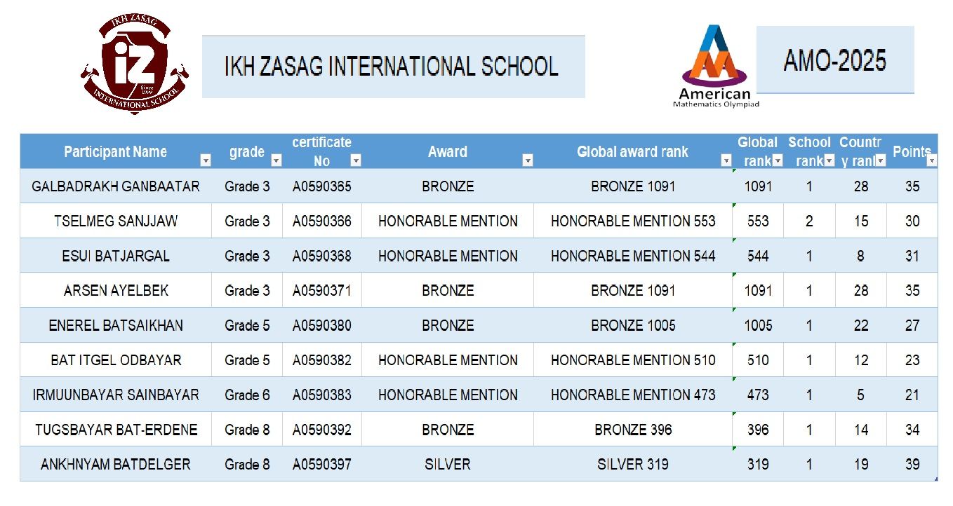 54 орны 300,000 сурагчид оролцсон Сингапур-Азийн АМО олон улсын математикийн олимпиадад, манай сургуулиас 34 сурагч оролцсоноос мөнгө – 1 хүрэл –4 тусгай байр -4 сурагч эзэллээ. Мөнгөн медаль 8а Б.Анхням, Хүрэл медаль 3в Г.Галбадрах, 3в А.Арсен, 5а Б.Энэрэл, 8б Б.Төгсбаяр хүртэж Тусгай байрыг 3в С.Цэлмэг, 3в Б.Есүй, 5а О.Бат-Итгэл, 6а С.Ирмүүнбаяр нар эзэллээ.
